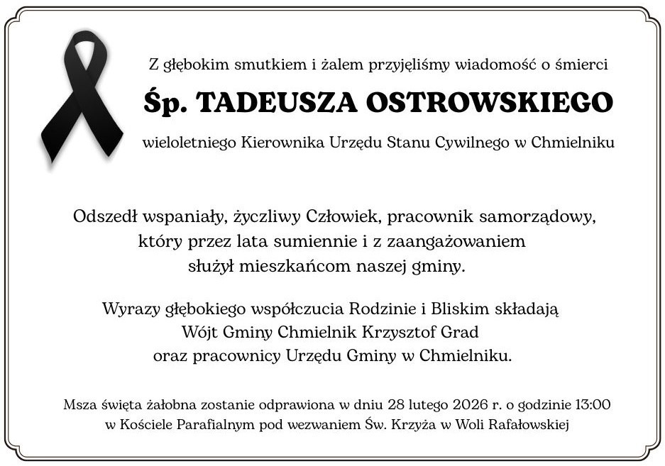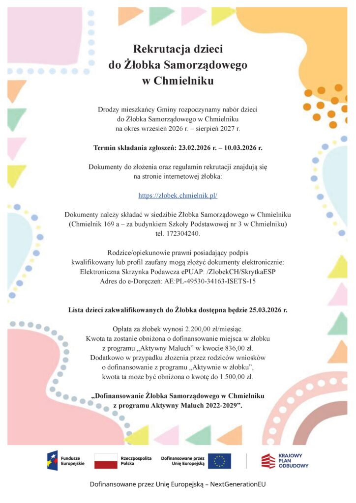 Drodzy mieszkańcy Gminy rozpoczynamy nabór dzieci do Żłobka Samorządowego w Chmielniku na okres wrzesień 2026 r. – sierpień 2027 r. Termin składania zgłoszeń: 23.02.2026 r. – 10.03.2026 r. Dokumenty do złożenia oraz regulamin rekrutacji znajdują…